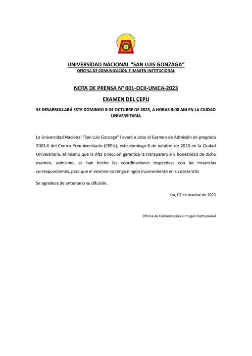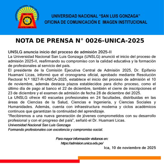 Nuestra casa de estudios Universidad Nacional «San Luis Gonzaga» (UNSLG) da inicio oficial a su Proceso de Admisión 2025-II.