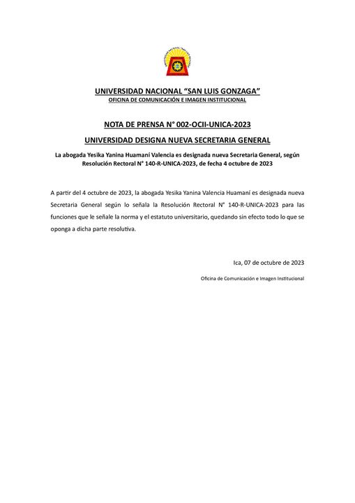 #NotadePrensa | Universidad San Luis Gonzaga designa nueva Secretaria General. La abogada Yesika Yanina Huamaní Valencia es designada nueva Secretaria General, según Resolución Rectoral N° 140-R-UNICA-2023, de fecha 4 octubre de 2023