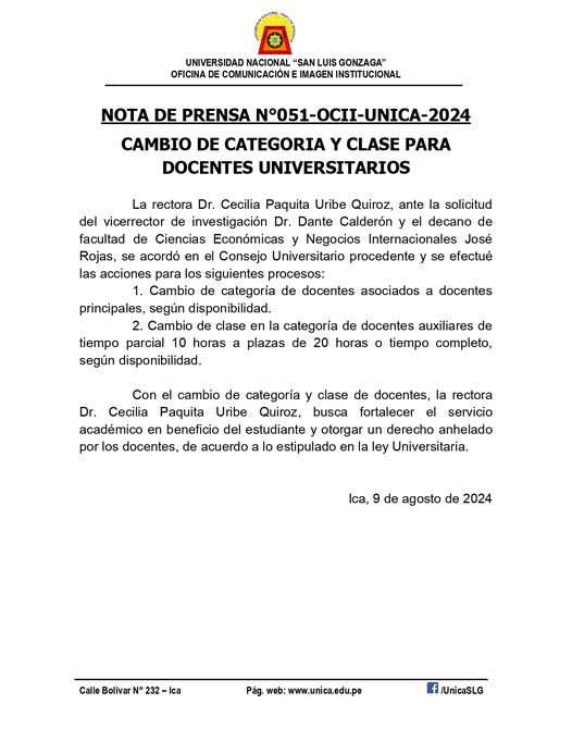 La rectora Dr. Cecilia Paquita Uribe Quiroz, ante la solicitud del vicerrector de investigación Dr. Dante Calderón y el decano de facultad de Ciencias Económicas y Negocios Internacionales José Rojas, se acordó en el Consejo Universitario procedente y se efectué las acciones para los siguientes procesos: