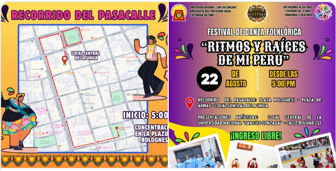 Continuamos con el Festival de Danzas Folclóricas «RITMOS Y RAÍCES DE MI PERÚ» en el Centro Cultural – UNICA, donde academias y asociaciones culturales nos deleitarán con lo mejor de nuestro arte y nuestras raíces.