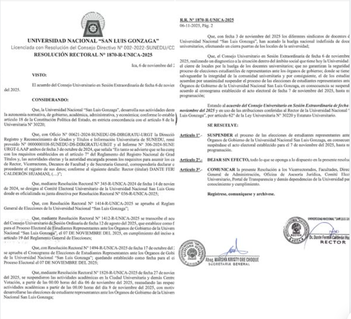 #EleccionesEstudiantiles | Ante los cierre de los locales por la huelga indefinida de docentes universitarios y salvaguardando la integridad de la comunidad universitaria y por consiguiente, el de los estudiantes, el Consejo Universitario acuerda SUSPENDER el proceso de las elecciones de estudiantes representantes ante los Órganos de Gobierno de la Universidad Nacional San Luis Gonzaga, establecido para el 7 de noviembre del 2025, hasta nueva programación.