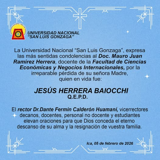 | La Universidad Nacional “San Luis Gonzaga”, expresa las más sentidas condolencias al Doc. Mauro Juan Ramírez Herrera, docente de la Facultad de Ciencias Económicas y Negocios Internacionales, por la irreparable pérdida de su señora Madre, quien en vida fue: