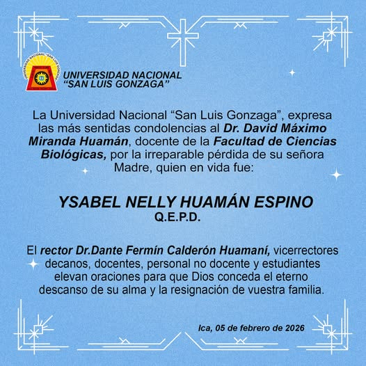 | La Universidad Nacional “San Luis Gonzaga”, expresa las más sentidas condolencias al Dr. David Máximo Miranda Huamán, docente de la Facultad de Ciencias Biológicas, por la irreparable pérdida de su señora Madre, quien en vida fue:
