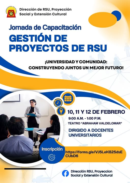 El objetivo del evento es fortalecer las capacidades de los docentes universitarios en la formulación, ejecución y evaluación de proyectos de Responsabilidad Social Universitaria (RSU), promoviendo iniciativas con impacto positivo en la comunidad y el desarrollo sostenible.