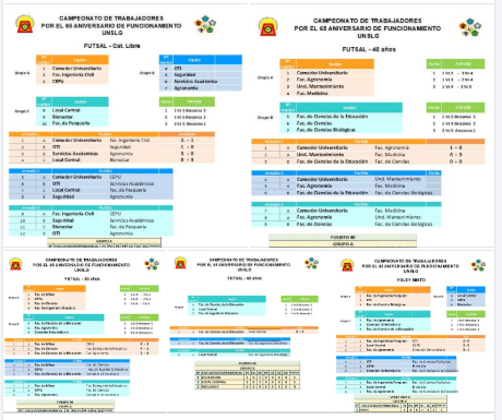 Culminada la primera fecha del Campeonato Deportivo de Confraternidad de Trabajadores, en el marco de las celebraciones por el 65.º aniversario de funcionamiento de la Universidad Nacional San Luis Gonzaga, repasamos los resultados y les entregamos la tabla de posiciones en las disciplinas de fútbol sala, categorías Libre, Senior (40 años), Máster (50 años) y Súper Máster (60 años), así como en vóley mixto.