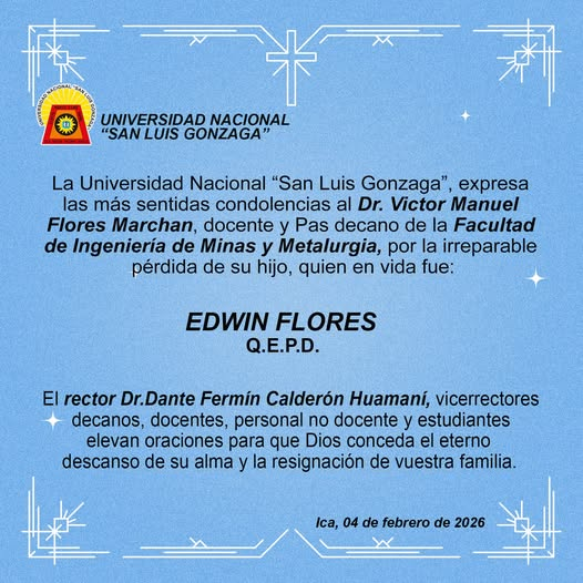 | La Universidad Nacional “San Luis Gonzaga”, expresa las más sentidas condolencias al Dr. Víctor Manuel Flores Marchan, docente y Pas decano de la Facultad de Ingeniería de Minas y Metalurgia, por la irreparable pérdida de su hijo, quien en vida fue:
