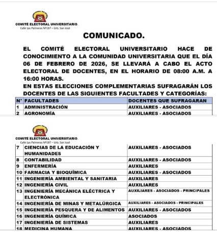 #CEU | El Comité Electoral Universitario, hace de conocimiento a la comunidad universitaria que el día 06 de febrero de 2026, se llevará a cabo el acto electoral de docentes, en el horario de 08:00 a.m. a 16:00 horas.