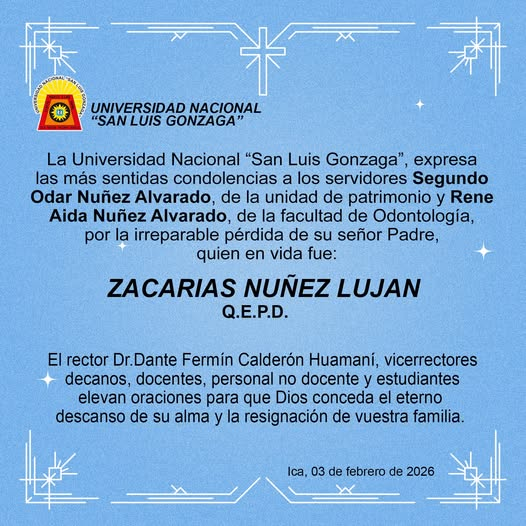 | La Universidad Nacional “San Luis Gonzaga”, expresa las más sentidas condolencias a los servidores Segundo Odar Nuñez Alvarado, de la unidad de patrimonio y Rene Aida Nuñez Alvarado, de la facultad de Odontología, por la irreparable pérdida de su señor Padre, quien en vida fue: