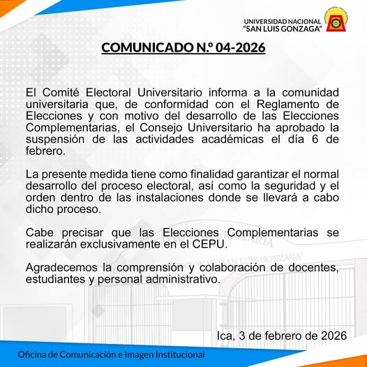 #COMUNICADO | El Comité Electoral Universitario informa a la comunidad universitaria que, de conformidad con el Reglamento de Elecciones y con motivo del desarrollo de las Elecciones Complementarias, el Consejo Universitario ha aprobado la suspensión de las actividades académicas el día 6 de febrero.