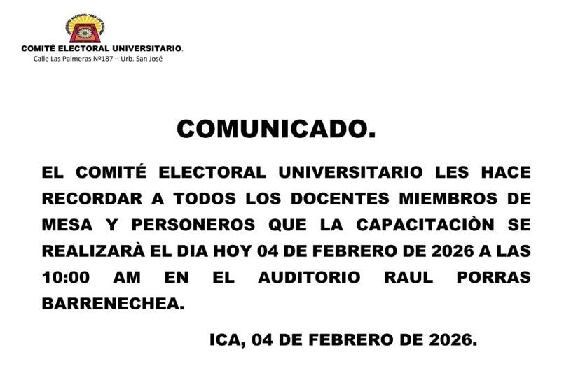 #CEU | El Comité Electoral Universitario les hace recordar a todos los docentes miembros de mesa y personeros que la capacitación se realizará el día hoy 04 de febrero de 2026 a las 10:00 Am En El Auditorio Raúl Porras Barrenechea.
