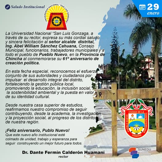 La Universidad Nacional “San Luis Gonzaga, a través de su rector, expresa su más cordial saludo y sincera felicitación al señor alcalde distrital, Ing. Abel William Sánchez Cahuana, Consejo Municipal, funcionarios, trabajadores municipales y a todo el pueblo de Pueblo Nuevo, en la Provincia de Chincha al conmemorarse su 61º aniversario de creación política.
