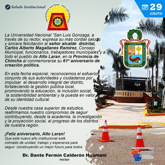 La Universidad Nacional “San Luis Gonzaga, a través de su rector, expresa su más cordial saludo y sincera felicitación al señor alcalde distrital, Carlos Alberto Magallanes Ramírez, Consejo Municipal, funcionarios, trabajadores municipales y a todo el pueblo de Alto Laran, en la Provincia de Chincha al conmemorarse su 61º aniversario de creación política.