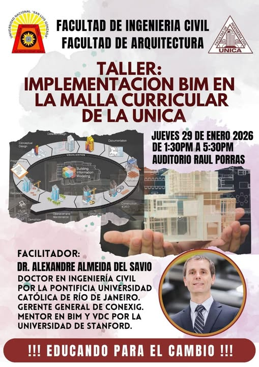 Se contará con la participación del Dr. Alexandre Almeida Del Savio, doctor en Ingeniería Civil por la Pontificia Universidad Católica de Rio de Janeiro. Gerente General de Conexig, mentor en BIM y VDC por la Universidad de Stanford.