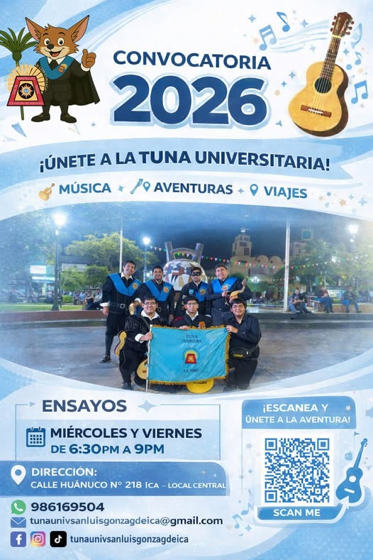 La Universidad Nacional «San Luis Gonzaga» a través de la Dirección de RSU, Proyección Social y Extensión Cultural invitan a todos sus estudiantes a formar parte de la Tuna Universitaria, un espacio donde la música, la tradición y la hermandad se unen para vivir experiencias inolvidables.