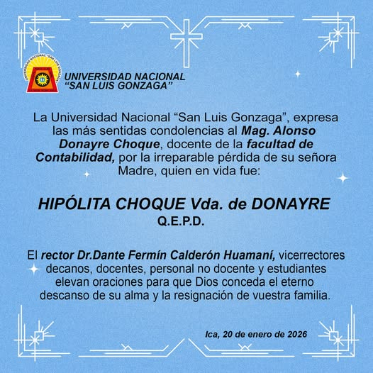 | La Universidad Nacional “San Luis Gonzaga”, expresa las más sentidas condolencias al Mag. Alonzo Donayre Choque, docente de la facultad de Contabilidad, por la irreparable pérdida de su señora Madre, quien en vida fue: