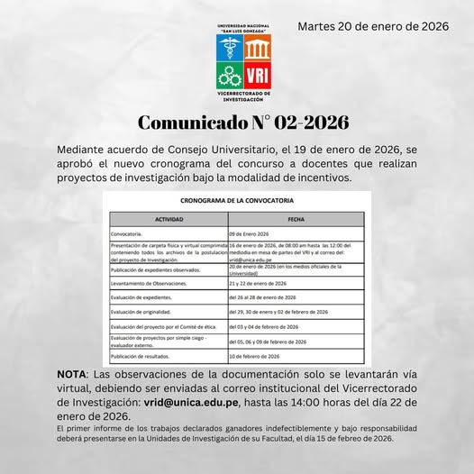 Mediante acuerdo de Consejo Universitario, se aprobó el nuevo cronograma del concurso a docentes que realizan proyectos de investigación bajo la modalidad de incentivos.