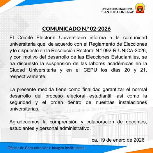 El Comité Electoral Universitario informa a la comunidad universitaria que, de acuerdo con el Reglamento de Elecciones y lo dispuesto en la Resolución Rectoral N.º 092-R-UNICA-2026, y con motivo del desarrollo de las Elecciones Estudiantiles, se ha dispuesto la suspensión de las labores académicas en la Ciudad Universitaria y en el CEPU los días 20 y 21, respectivamente.