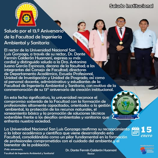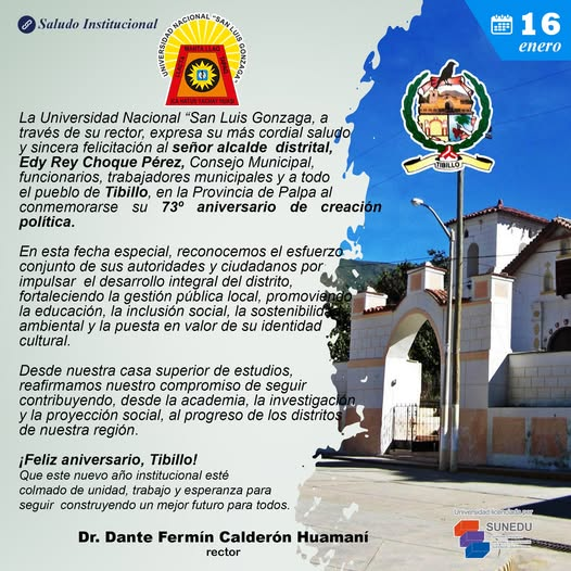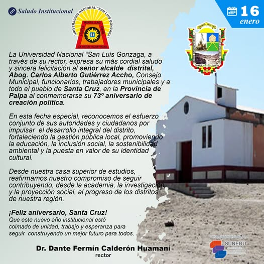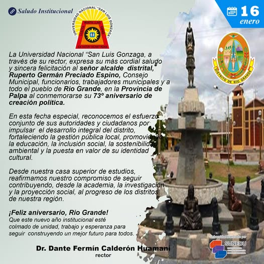 La Universidad Nacional “San Luis Gonzaga, a través de su rector, expresa su más cordial saludo y sincera felicitación al señor alcalde distrital, Ruperto German Preciado Espino, Consejo Municipal, funcionarios, trabajadores municipales y a
