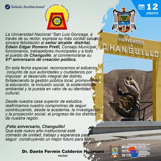 #SaludosInstitucionales2026 | La Universidad Nacional “San Luis Gonzaga, a través de su rector, expresa su más cordial saludo y sincera felicitación al señor alcalde distrital, Edwin Edgar Romero Pretil, Consejo Municipal, funcionarios, trabajadores municipales y a todo el pueblo de Changuillo, al conmemorarse su 81º aniversario de creación política.