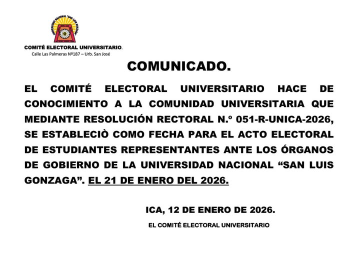 #COMUNICADO | El comité electoral universitario hace de conocimiento a la comunidad universitaria que mediante resolución rectoral Nº 051-R-UNICA-2026, se estableció como fecha para el acto electoral de estudiantes representantes ante los órganos de gobierno de la Universidad Nacional «San Luis Gonzaga». El 21 de Enero de 2026.