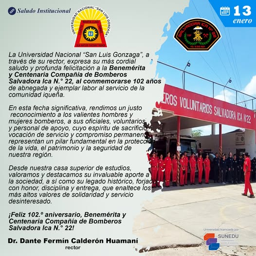 #SaludosInstitucionales2026 | La Universidad Nacional “San Luis Gonzaga”, a través de su rector, expresa su más cordial saludo y profunda felicitación a la Benemérita y Centenaria Compañía de Bomberos Salvadora Ica N.° 22, al conmemorarse 102 años de abnegada y ejemplar labor al servicio de la comunidad iqueña.