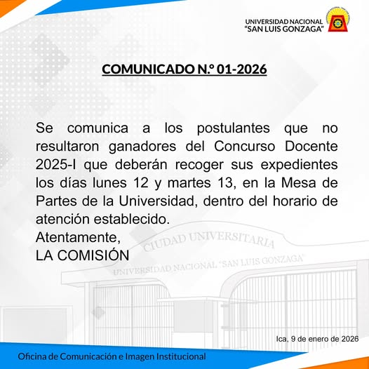 Se comunica a los postulantes que no resultaron ganadores del Concurso Docente 2025-I que deberán recoger sus expedientes los días lunes 12 y martes 13, en la Mesa de Partes de la Universidad, dentro del horario de atención establecido.