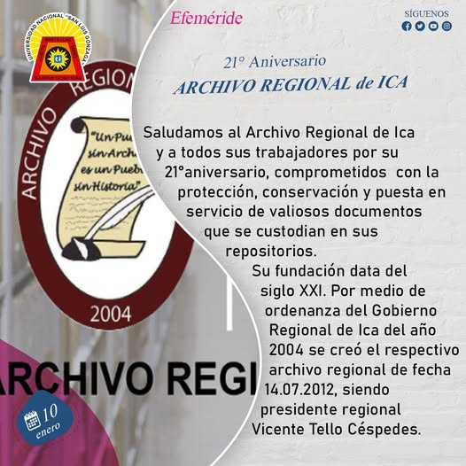#Efemerides2026 | Saludamos al Archivo Regional de Ica y a todos sus trabajadores por su 21°aniversario, comprometidos con la protección, conservación y puesta en servicio de valiosos documentos que se custodian en sus repositorios.
