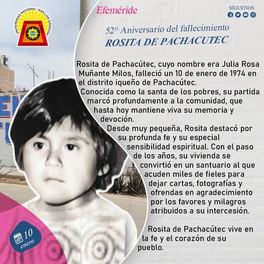 #Efemerides2026 | Rosita de Pachacútec, cuyo nombre era Julia Rosa Muñante Milos, falleció un 10 de enero de 1974 en el distrito iqueño de Pachacútec. Conocida como la santa de los pobres, su partida marcó profundamente a la comunidad, que hasta hoy mantiene viva su memoria y devoción.