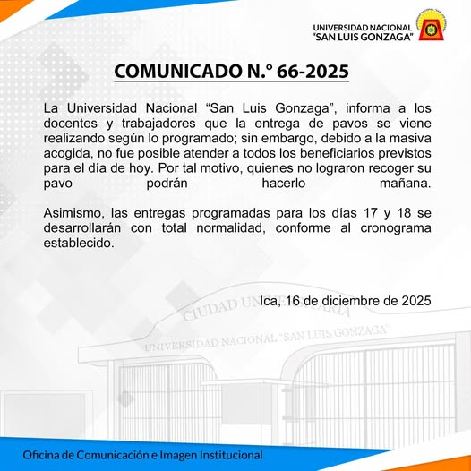 #Comunicado | La Universidad Nacional “San Luis Gonzaga”, informa que la entrega de pavos se viene realizando según lo programado; sin embargo, debido a la masiva acogida, no fue posible atender a todos los beneficiarios previstos para el día de hoy. Por tal motivo, quienes no lograron recoger su pavo podrán hacerlo mañana. Asimismo, las entregas programadas para los días 17 y 18 se desarrollarán con total normalidad, conforme al cronograma establecido.