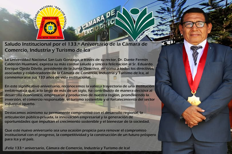 La Universidad Nacional San Luis Gonzaga, a través de su rector, Dr. Dante Fermín Calderón Huamaní, expresa su más cordial saludo y sincera felicitación al Sr. Eduardo Enrique Ojeda Dávila, presidente de la Junta Directiva, así como a todos los directivos, asociados y colaboradores de la Cámara de Comercio, Industria y Turismo de Ica, al conmemorarse sus 133 años de vida institucional.