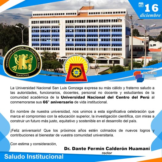 #SaludosInstitucionales2025 | La Universidad Nacional San Luis Gonzaga expresa su más cálido y fraterno saludo a las autoridades, funcionarios, docentes, personal no docente y estudiantes de la comunidad académica de la Universidad Nacional del Centro del Perú (Sitio Oficial) al conmemorarse sus 66° aniversario de vida institucional.