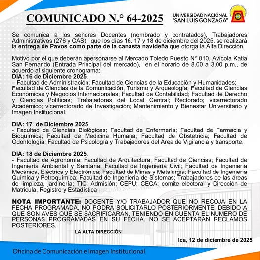 #COMUNICADO | Se comunica a los señores Docentes (nombrado y contratados), Trabajadores Administrativos (276 y CAS), que los días 16, 17 y 18 de diciembre del 2025, se realizará la entrega de Pavos como parte de la canasta navideña que otorga la Alta Dirección.
