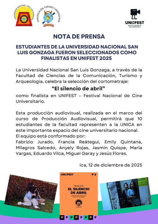 La Universidad Nacional San Luis Gonzaga, a través de la Facultad de Ciencias de la Comunicación, Turismo y Arqueología, celebra la selección del cortometraje “El silencio de abril” como finalista en UNIFEST – Festival Nacional de Cine Universitario, una importante vitrina del talento audiovisual universitario a nivel nacional.